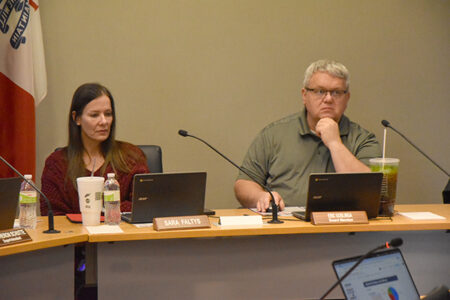 T-R PHOTO BY LANA BRADSTREAM — Marshalltown Community School District Board of Education members Sara Faltys and Eric Goslinga listen to reports during Monday’s regular meeting. The vote approving construction contracts for the Reimagine Miller project was unanimous.