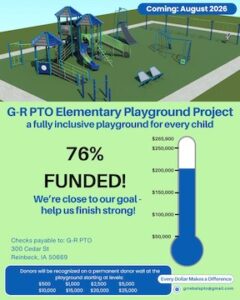 “The G-R PTO is raising funds for a brand-new, fully inclusive playground designed so all kids can play together, featuring accessible surfaces, ramps, and engaging equipment for every ability,” the PTO posted to social media April 10. “We’re already 76% of the way to our goal – and with your help, we can cross the finish line! Every donation, big or small, makes a real impact. To recognize our amazing community, donors will be honored on a permanent donor wall at the playground.”