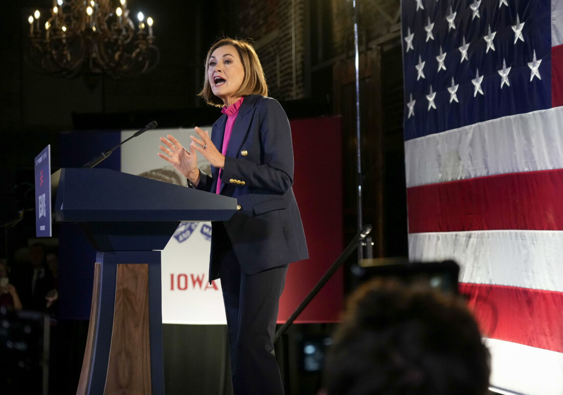 AP photo Gov. Kim Reynolds speaks during a rally with presidential candidate Florida Gov. Ron DeSantis on Nov. 6 in Des Moines.