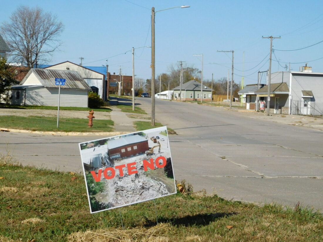 Signs opposing the bond were plentiful throughout Gladbrook. Most were small. A few were big. Many were hand-written. Half a dozen were on the street connecting downtown with G-R’s football field. One particularly biting version had six big letters — VOTE NO — against the background of a photograph of the Gladbrook school building in mid-demolition in June 2022.