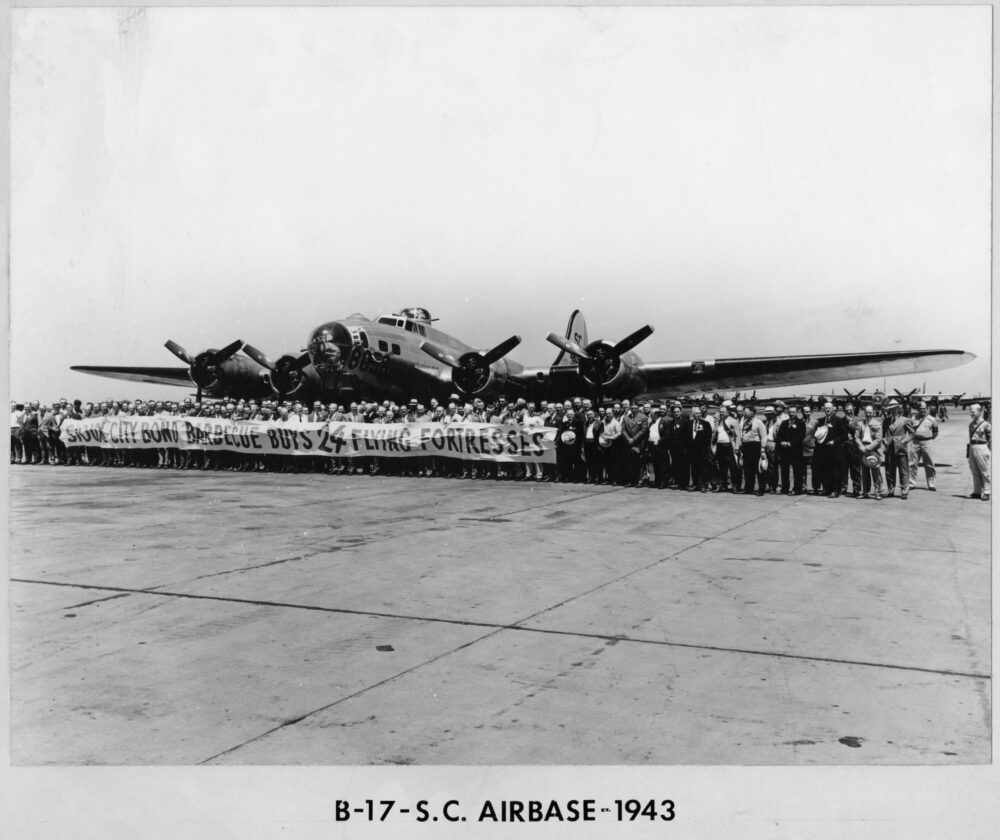 Photo via the 185th air refueling wing website A photo of a large group of Sioux City residents holding a sign “Sioux City Bond Barbecue Buys 24 Flying Fortresses,” in front of a U.S. Army Air Corp B-17 at the Sioux City Army Air Base during the summer of 1943.