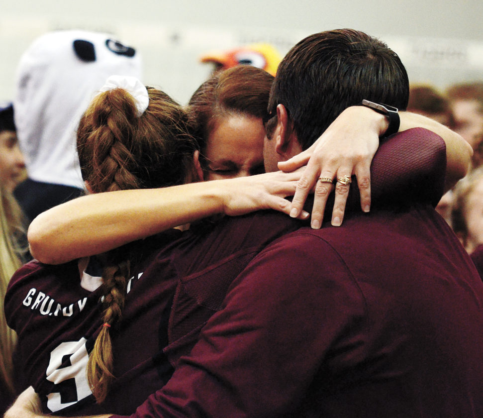 T-R PHOTO BY STEPHEN KOENIGSFELD • The Willis family — daughter Kylie, left, mother Lori, middle, and father Jesse, right — hug during the celebration of the Spartans’ four-set win against No. 5 Tri-Center in the Class 2A Region 4 final Nov. 1 in West Des Moines. Lori is also the head coach at Grundy Center and has been coaching Kylie since she was little.