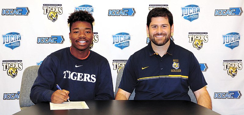 PHOTO PROVIDED • Marshalltown Community College sophomore David Kromah, left, is joined by head men’s soccer coach Rafael Martinez as he signs his National Letter of Intent to play at NCAA Division II Northern Michigan University in Marquette, Mich.