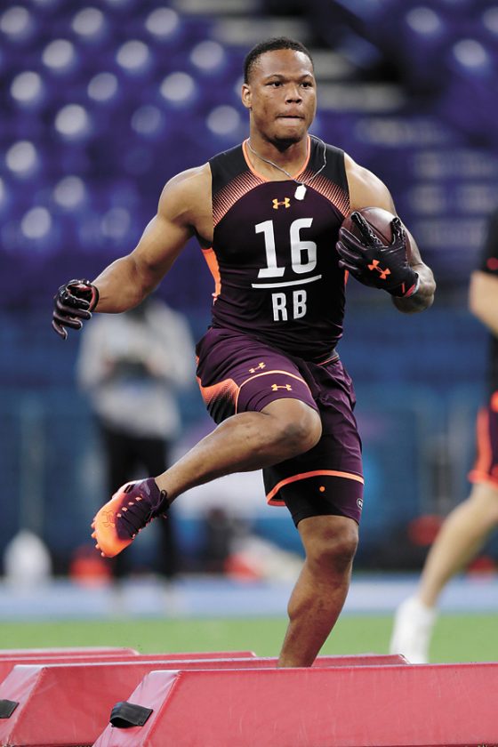 Former Iowa State running back David Montgomery participates in drills at the 2019 NFL Combine at Lucas Oil Stadium in Indianapolis. Montgomery ran a time of 4.63 seconds in his 40-yard dash, he did 15 repetitions of 225 pounds in the bench press, jumped 28 1/2 inches in his vertical jump and 121 inches in his broad jump.