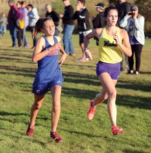 - T-R PHOTO BY ANDREW ABADIE – Marshalltown sophomore Phoebe Hermanson, left, races Waukee senior Isabelle Schaffer down the homestretch at the CIML Iowa Conference meet on Thursday at the Marshalltown Community College course. Schaffer finished fifth and Hermanson placed sixth in a personal-best time of 19 minutes, 36.4 seconds.