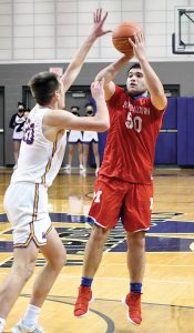 - T-R PHOTO BY NOAH ROHLFING – Marshalltown senior Isaiah Borgos (50) shoots over Waukee’s Payton Sandfort during Friday’s game at Waukee. Borgos scored 14 points in his final basketball game as a Bobcat.