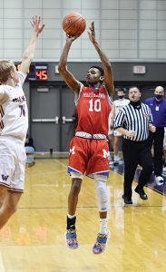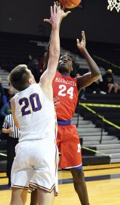 - T-R PHOTO BY NOAH ROHLFING – Marshalltown sophomore Prince Jallah (24) shoots over Waukee’s Payton Sandford (20) during Friday’s Class 4A Substate 8 semifinal basketball game at Waukee.