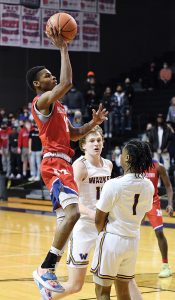- T-R PHOTO BY NOAH ROHLFING – Marshalltown junior guard Armonniey Thomas shoots over Waukee defenders Malik Allen (1) and Tucker DeVries, center, during the first half of Friday’s Class 4A Substate 8 semifinal basketball game in Waukee. Thomas scored a game-high 24 points in the Bobcats’ 54-48 loss.