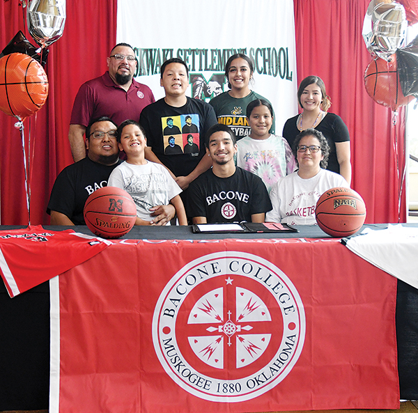 T-R PHOTO BY NOAH ROHLFING - Meskwaki Settlement School graduate Taurice Grant, seated center, signed his National Letter of Intent to play basketball at Bacone College, an NAIA institution in Muskogee, Okla. With Grant for his signing ceremony were (clockwise from Taurice) brother Traycen Grant, father Garner Grant, Bacone head coach Ruben Little Head Sr., cousins Desmond Kapayou and Tori Lasley, sister Tariah Grant, grandfather Roy Kapayou, cousin Geanna Bear, and mother Christina Alamo.