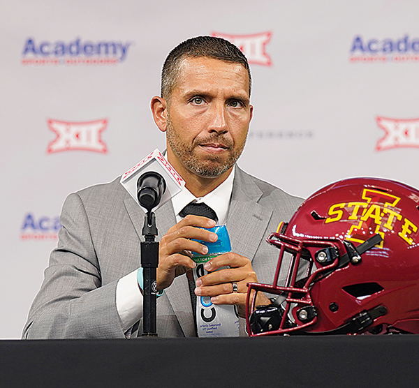 AP PHOTO - Iowa State football coach Matt Campbell listens to a reporter’s question during Big 12 media days Wednesday in Arlington, Texas.