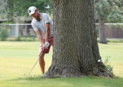 - T-R PHOTO BY NOAH ROHLFING – Chad Plaehn punches out from a challenging spot along the fourth fairway during Sunday’s final round of the City Golf Tournament at the American Legion Memorial Golf Course.