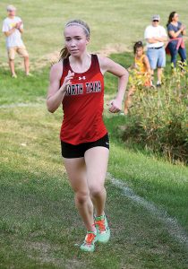 - T-R PHOTO BY NOAH ROHLFING – North Tama junior Grace Lidgett leads Marion’s Peyton Steffen up a hill during Monday’s South Tama Invitational in Tama. LIdgett won the race with her time of 20 minutes, 35.9 seconds, helping the Redhawks rank second in the final team standings.