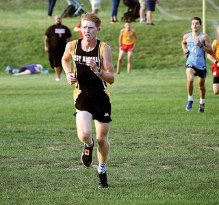 - T-R PHOTO BY NOAH ROHLFING – West Marshall senior Nicholas Thompson holds an advantage over South Tama’s Tommy Tyynismaa, far right, as they near the finish line at Monday’s South Tama Invitational in Tama. Thompson placed third and Tyynismaa fourth to lead their respective squads.