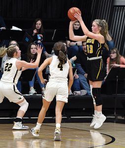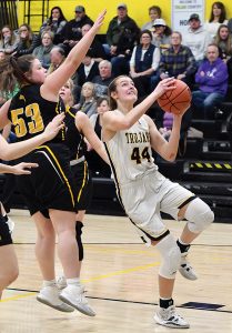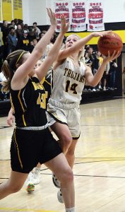 - T-R PHOTO BY NOAH ROHLFING – West Marshall junior guard Keatan Pfantz (14) shoots over BCLUW senior center Katie Hill (43) during the first half of Tuesday’s basketball game in State Center. The Class 3A No. 12 Trojans defeated the visiting Comets 48-37.