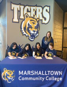 - PHOTO PROVIDED – Marshalltown Community College interim women’s soccer coach Allie Osmundson looks on as Emma Lizarde (from left), Anahi Tellez, Samantha Trowbridge and Carlie Herdlicka sign their letters of intent to be a part of MCC’s inaugural team in the fall of 2022.