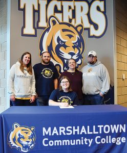 - PHOTO PROVIDED – West Marshall High School senior Gabby Eirikson (seated center) signs her letter of intent to join the MCC women’s soccer program in the fall. Standing behind Eirikson at her signing ceremony are (from left) coach Osmundson, father Chris Eirikson, mother Deborah and stepfather Seth McElroy. Not pictured is Gabby’s stepmother Kendal Eirikson.