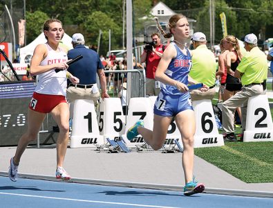 - T-R PHOTO BY NOAH ROHLFING – Marshalltown senior Rachel Smith (7) enters the first turn during her leg of the Class 4A girls’ 4×800-meter relay Thursday at Drake Stadium in Des Moines. The Bobcat quartet of Micah Blevins, Smith, Grace Rasmussen and Phoebe Hermanson finished 19th in a season-best time of 10 minutes, 2.98 seconds.