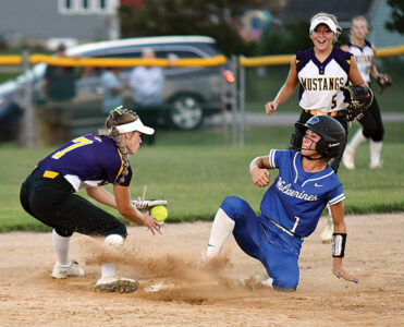 - T-R PHOTO BY ROSS THEDE – Second baseman Camy Weeks (5) watches intently as East Marshall shortstop Emma Pfantz (7) gloves the throw from catcher Kennedy Wheater as Dike-New Hartford’s Taylor Kvale (1) successfully steals second in the top of the seventh inning. Kvale scored the Wolverines’ only run as East Marshall advanced with a 2-1 victory.