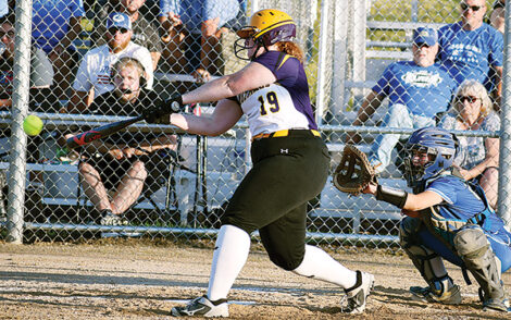 - T-R PHOTO BY ROSS THEDE – East Marshall senior catcher Kennedy Wheater (19) rips a single up the middle for one of her team-leading two hits during Friday’s regional semifinal softball game in Le Grand.