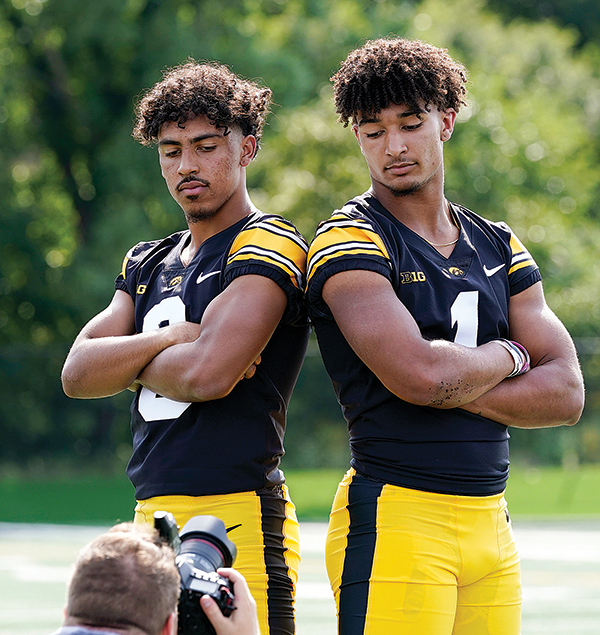 AP PHOTO - Iowa defensive backs TJ Hall, left, and Xavier Nwankpa pose for a photographer during the Hawkeyes’ football media day Friday in Iowa City.