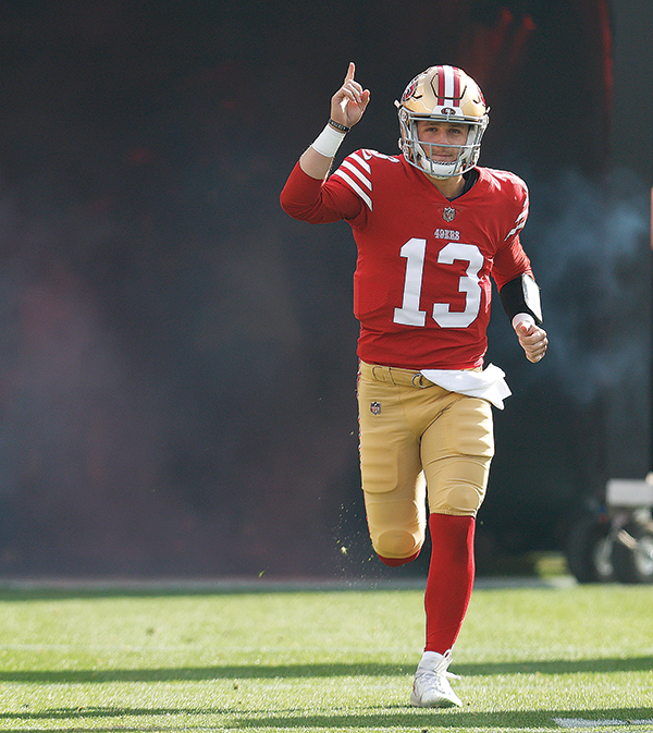 AP PHOTO - San Francisco 49ers quarterback Brock Purdy gestures as he runs onto the field during player introductions before Saturday’s NFL game against the Washington Commanders in Santa Clara, Calif.