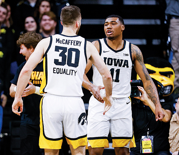 AP PHOTO BY JIM SLOSIAREK/THE GAZETTE - Iowa guard Tony Perkins (11) slaps hands with fellow guard Connor McCaffery (30) after drawing a Maryland foul during the first half of a college basketball game Sunday in Iowa City.