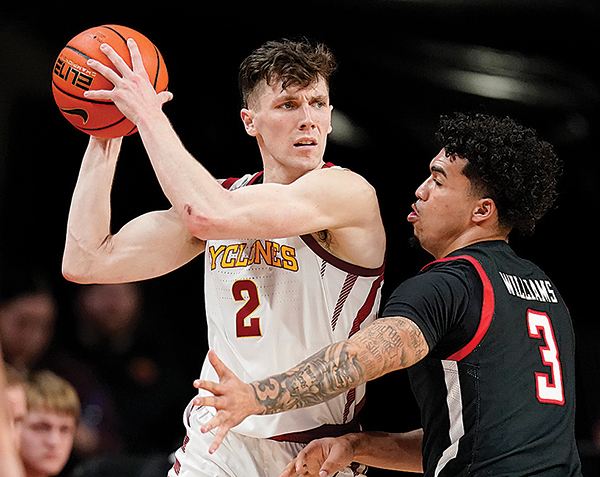 AP FILE PHOTO - Iowa State guard Caleb Grill (2) looks to pass around Texas Tech guard D’Maurian Williams during the second half of a Big 12 Conference basketball game Jan. 10 at Hilton Coliseum in Ames.
