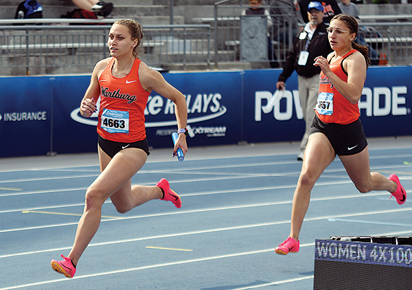 T-R PHOTO BY JAKE RYDER - JoJo Tyynismaa, left, takes the baton for the Wartburg College women's 4x100-meter relay team during Friday's preliminaries at the Drake Relays in Des Moines. Tyynismaa is a 2022 South Tama graduate.