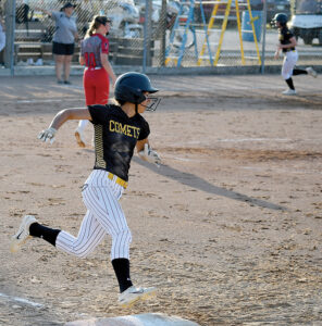 - T-R PHOTO BY JAKE RYDER – BCLUW head coach Megan Yantis, top left, sends courtesy runner Brinna Benson home as Raegan Crawford makes the turn at first base on her run-scoring single during Tuesday’s North Iowa Cedar League softball game in Conrad. The Comets won 12-0 in three innings.