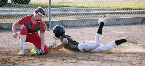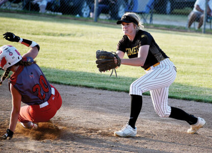 - T-R PHOTO BY JAKE RYDER – BCLUW second baseman Grace Farnsworth, right, catches the throw as Aplington-Parkersburg’s Jordan Trueblood (20) slides in safely during Tuesday’s NICL softball game in Conrad.