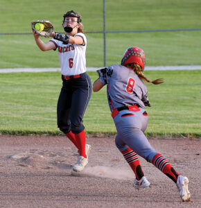 - T-R PHOTO BY ROSS THEDE – MHS senior first baseman Kristin Hays, right, fields the ball as Fort Dodge’s Meah McCaleb races past her during the first game of Thursday’s softball doubleheader at MHS.