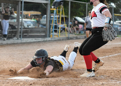 - T-R PHOTO BY JAKE RYDER – BCLUW catcher Cassie Nason, left, attempts to tag North Tama’s Violet Seda in the fifth inning of Friday’s Class 1A Region 6 first-round game in Conrad. Seda was safe on the play.