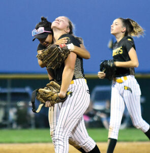 - T-R PHOTO BY JAKE RYDER – BCLUW pitcher Klayre Gallentine shares a look of relief as she is embraced by teammate Raegan Crawford following the final out of the Comets’ 12-10 victory over North Tama in a Class 1A Region 6 softball opener on Friday in Conrad.