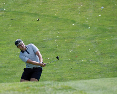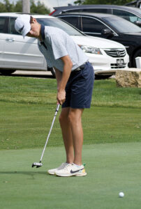 - T-R PHOTO BY JAKE RYDER – Marshalltown’s Eli Polley pitches into the 18th green at Elmwood Country Club during Monday’s home-opening dual meet against Des Moines Lincoln. Polley was the meet’s third-leading scorer with his round of 80.
