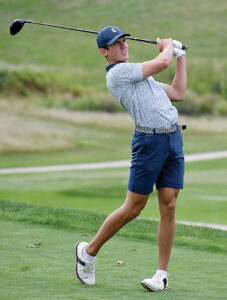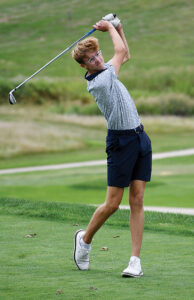 - T-R PHOTO BY JAKE RYDER – Marshalltown senior Ryan Schmit follows through on his tee shot on the 18th hole at Elmwood Country Club during Monday’s Iowa Alliance Conference dual meet against Des Moines Lincoln. Schmit shot a medalist round of 2-over-par 72 to lead the Bobcats to a 317-436 victory.