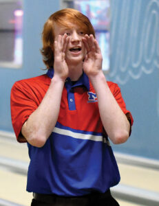 - T-R PHOTO BY JAKE RYDER – Marshalltown sophomore bowler Jayden Beichley yells out a rally cry after scoring a strike during Monday’s Iowa Alliance Conference dual meet against Fort Dodge at Wayward Social. Beichley’s 414 series led the Bobcats to a 2,737-2,623 victory over the Dodgers.