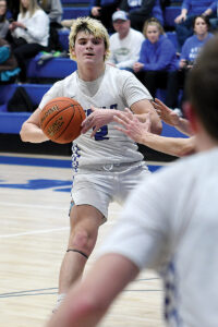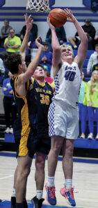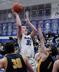 - T-R PHOTO BY JAKE RYDER – Gladbrook-Reinbeck junior center Michael Boyd (40) goes for the shot against Belle Plaine defenders Jax Stamp, left, and Riley Simmons (30) during the first half of Thursday’s Class 1A District 11 semifinal basketball game in Reinbeck. Boyd scored a game-high 17 points in the Rebels’ 56-51 win.