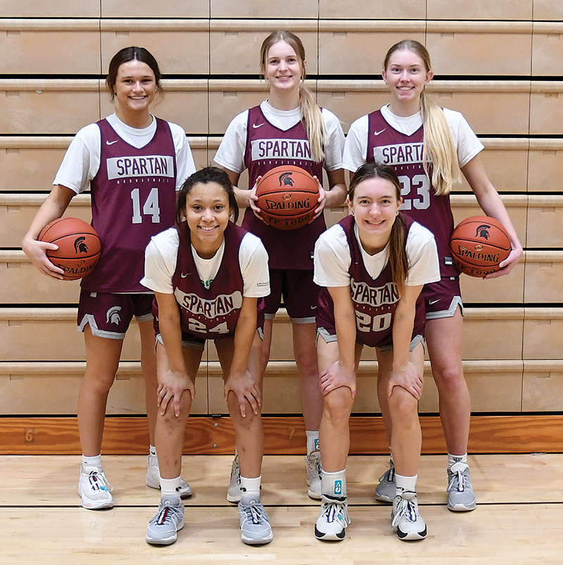 T-R PHOTO BY JAKE RYDER - Grundy Center girls basketball is heading back to the state tournament for the first time since 2021. This year’s seniors for the Spartans are front row, from left: Blessing Edittu and Lucy Lebo; back row: Laney Dole, Carlie Willis and Ellery Luhring.