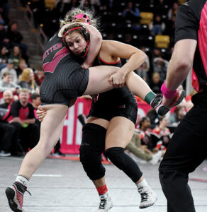 - T-R PHOTO BY JAKE RYDER – South Tama County sophomore Autumn Elsbury, front, nears a takedown against top-seeded Naomi Simon of Decorah during Saturday’s 170-pound championship match at the girls’ state wrestling tournament at Xtream Arena in Coralville. Simon, a University of Iowa recruit, won her fourth state title with a 15-2 major decision over Elsbury.