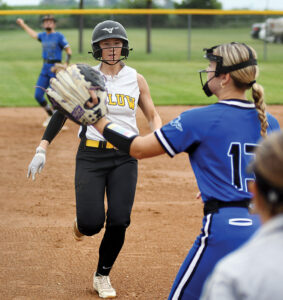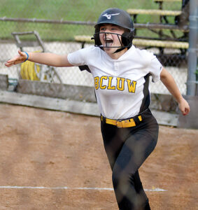 - T-R PHOTO BY JAKE RYDER – BCLUW pinch-runner Leila Wedgwood celebrates after scoring the first of five Comet runs in the sixth inning of Friday’s 9-3 victory over Montezuma in Conrad.
