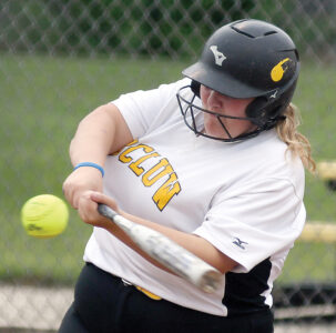- T-R PHOTO BY JAKE RYDER – BCLUW’s Morgan Bergman belts a double to lead off the bottom of the sixth inning during Friday’s non-conference softball game against Montezuma in Conrad. Bergman’s hit set the tone on a five-run rally for the Comets in a 9-3 victory over the Bravettes.
