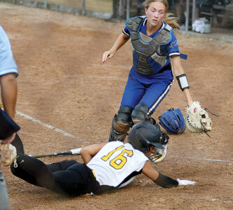 - T-R PHOTO BY JAKE RYDER – BCLUW’s Raegan Crawford (16) slides safely across the plate on a sacrifice fly off the bat of Cassie Nason as Montezuma catcher Ellen Cook, top, tries to retrieve the throw home.