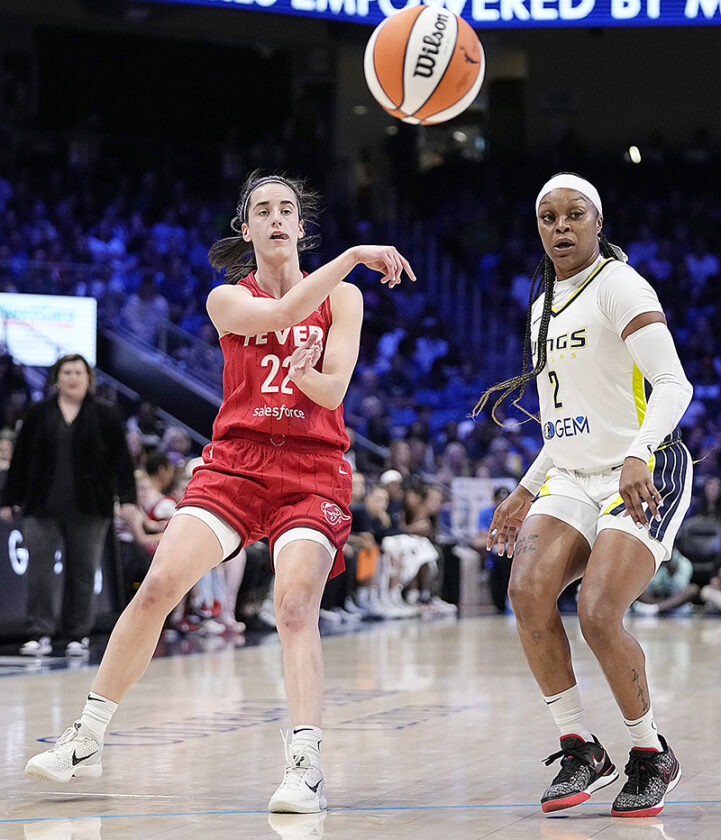 AP PHOTO - Indiana Fever's Caitlin Clark (22) makes a pass as Dallas Wings' Odyssey Sims (2) defends in the first half of a WNBA basketball game Wednesday in Arlington, Texas.