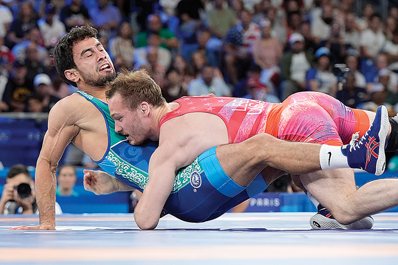 AP PHOTO - Spencer Lee, top, of the United States and Uzbekistan’s Gulomjon Abdullaev compete in their men’s freestyle 57-kilogram semifinal wrestling match on Thursday at Champ-de-Mars Arena during the 2024 Summer Olympics in Paris, France.
