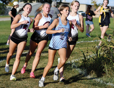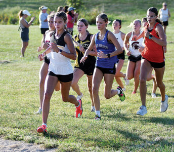 - T-R PHOTO BY JAKE RYDER – West Marshall freshman Dalaney Eldridge leads the girls’ race during the early stages of Monday’s South Tama Invitational in Tama. Pictured running alongside Eldridge include, from left, Grace Storjohann of Grundy Center, Kalia Stover of BCLUW, and Colo-NESCO’s Elizabeth Erickson.