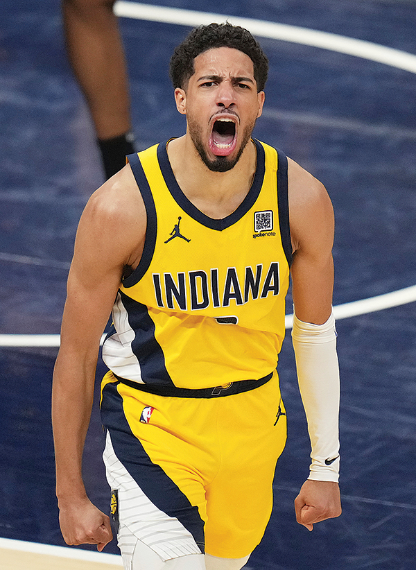 AP FILE PHOTO - Indiana Pacers guard Tyrese Haliburton celebrates during the first half of Game 3 of the NBA Eastern Conference finals against the New York Knicks on May 25 in Indianapolis.