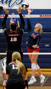 Kinsley Bowie had consecutive kills to make it 11-10 Marshalltown, and a late whistle ended a long scoring rally after a Fort Dodge blocker went into the net to make it 12-10.