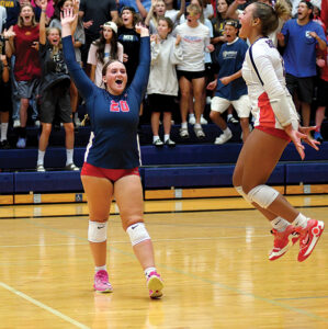 - T-R PHOTO BY ROSS THEDE – MHS seniors Harper Wilson (20) and Gianna Baune celebrate after Wilson scored back-to-back points to claim the third set of Tuesday’s contest.