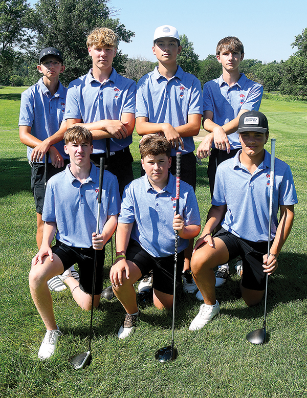 T-R PHOTO BY ROSS THEDE - The Marshalltown boys’ golf team returns three members of last year’s varsity squad in defense of four-straight Iowa Alliance Conference titles. Pictured (from left) are front row: Parker Christen, Korben McKibben and Joe Greazel; back row: Trae Misek, Jacob Seberger, Bryson Payne and Gavin Misek.