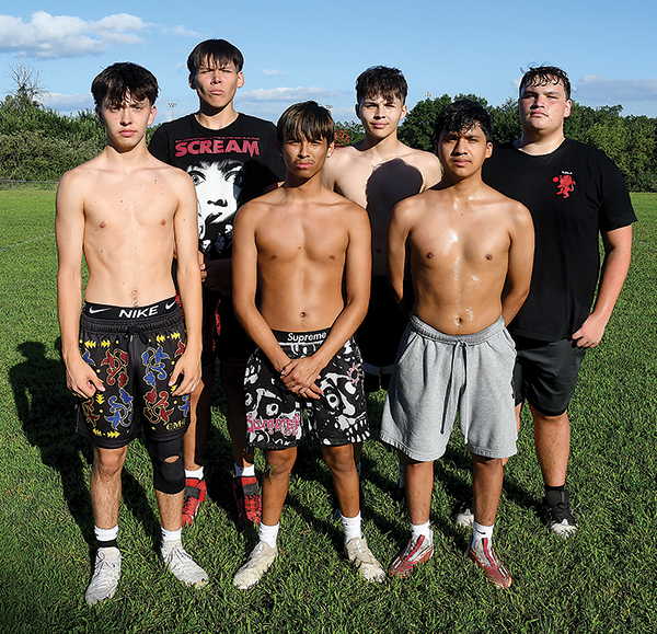 T-R PHOTO BY ROSS THEDE - Six letterwinners help comprise the Meskwaki Settlement School’s football roster this season as the Warriors search for their first win since 2020. Pictured (from left) are front row: Layne Steen, Devin Hoag and Dorian Velazquez; back row: Jayce Thompson, Cadell Buffalo and Kenley Ryan.